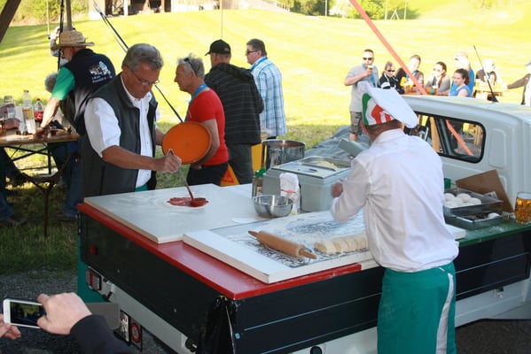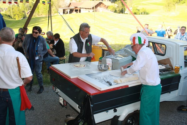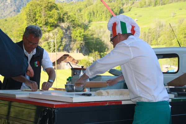 Bei Pizza Mobile Lucerna, laufen die Vorbereitungen an. Es gilt 120 Pizzas für unsere Gäste zuzubereiten. Im Minutentakt wurden die Pizzas vereilt. Da flog der Teig richtig zackig durch die Luft. Ein Bravo an unseren Stefano und sein Team.
