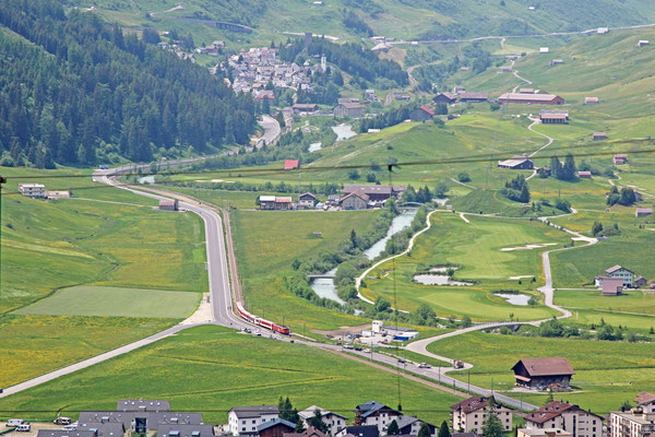 Blick auf Andermatt, mit der Strasse nach Hospental, wo sich die Strasse teilt,