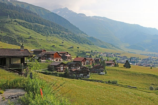 Noch ein Blick zurück auf den Camping Viva, und die Ruine der Burg Pontaningen, Tujetsch.