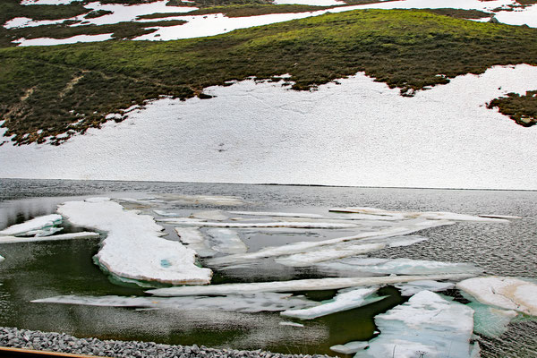 Eisschollen auf dem Oberalpsee, sind letzte Spuren des Winter.
