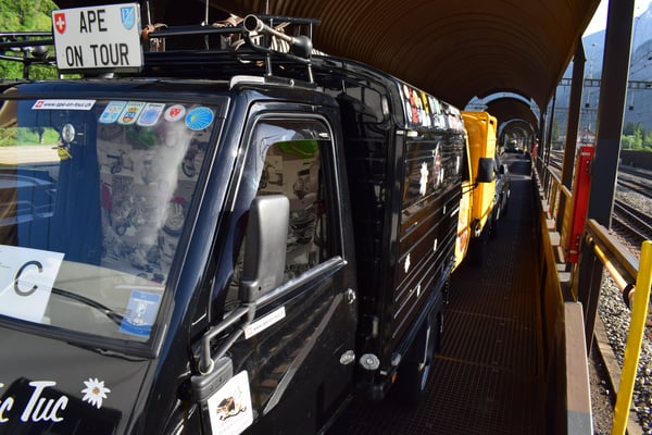 für die Fahrt durch den Lötschberg- und Simplontunnel verladen.
