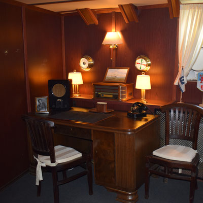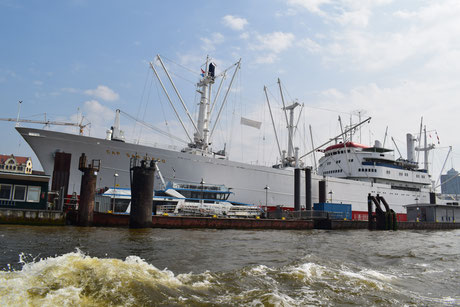 Die Cap San Diego liegt als Museumsschiff an der Überseebrücke im Hamburger Hafen. Sie wurde 1961 als Stückgutschiff gebaut und war bis 1983 im Linien-dienst mit Südamerika eingesetzt. Das Deckshaus war für bis 40 Besatzungsmitglieder ausgestattet. Zudem verfügte das Schiff auch über ein Passagierdeck mit Kabinen, Salon, Speisezimmer, Bar und Aussen-schwimmbad. Damals, als der Interkontinentalluft-verkehr noch nicht selbstverständlich war, nutzten viele Passagiere diese Variante für Süd-amerikareisen.