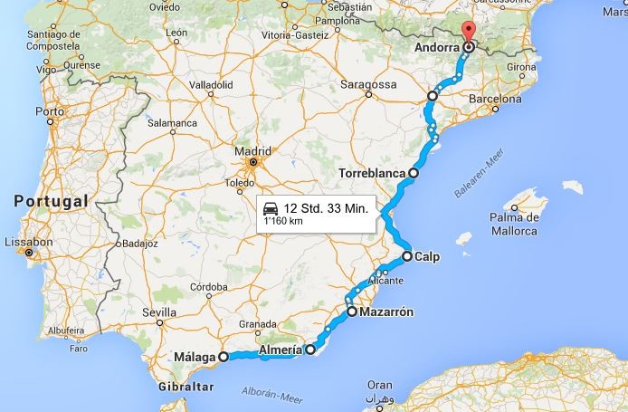 Ursprünglich hatte ich geplant von Cordoba durch das Landesinnere nach Andorra zu fahren. Da ich jedoch nach der Reparatur in Malaga, das Vertrauen in das Fahrzeug verloren hatte, wählte ich diese Route entlang der Küste. Falls ich dort liegen geblieben wäre, hätte ich bessere Möglichkeiten gehabt etwas zu unternehmen. In Landesinneren wäre ich sehr viel durch unbewohnte Gegenden gefahren.