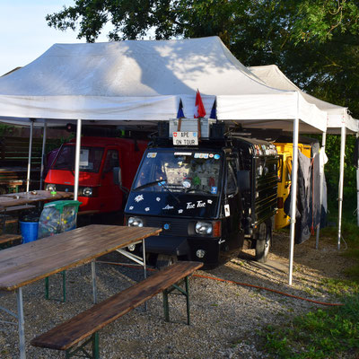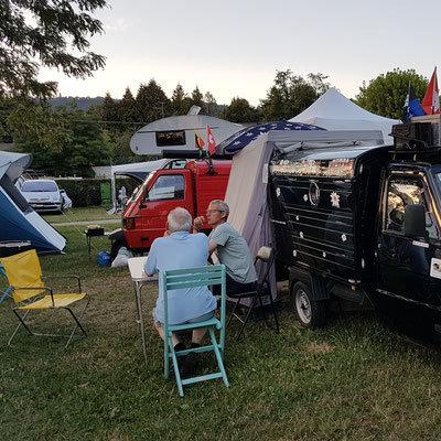 Er fragte was wir suchen würden? Nun ja, einen Platz zum Übernachten mit unseren Wohmmobilien. Er zeigte auf vier aufgestellte Pavillon, sobald das Boulturnier fertig sei, könnten wir die Tische wegräumen und uns darunter aufstellen. Ach und heute Abend sei, dann noch Musik und Tanz auf der Terrasse des Restaurants. Wir sollen doch auch kommen. Was soll man da noch sagen. Also der Abend war sehr unterhaltsam, leider habe ich meinen Fotoapparat in der Ape vergessen. Gut vielleicht war es auch besser.
