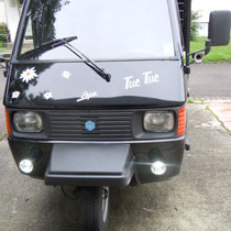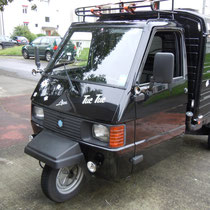 Um das Eindringen von Feuchtigkeit zu verhindern und zum Schutz des Blechs, habe ich sowohl die Bohrlöcher für die Kabeldurchführung wie auch für die Befestigung der Lampen mit sochen Kabeldurchgängen aus Gummi versehen. Nebenbei vermeide ich dadurch, dass die Lampenhalterung auf dem Blech der Frontwand scheuert, falls sich die Befestigungsschrauben durch die Vibrationen lösen sollten. Für die Befestigung habe ich rostfreie M5 Schrauben verwendet. Natürlich habe ich zum Schutz des Gummis noch Unterlagsschei-ben verwendet. Da die Frontpartie der Ape gewölbt ist muss die Halterung der Lampen noch etwas gerichtet werden, damit die Ausleuchtung korrekt ist.