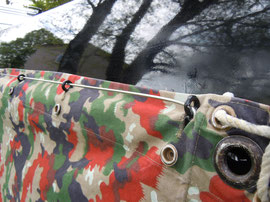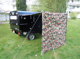 Vor einigen Jahren kaufte ich in einem Liq-Shop der Armee, vier Ausschuss-Zelteinheiten. Diese verwendete ich um meinen Kofferraum des „normalen“ Autos bei grösseren Transporten zu schützen. Nun aber habe ich mich gefragt, ob sich daraus nicht auch ein Vorzelt für mein Tuc Tuc zu bauen.