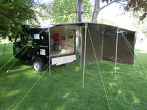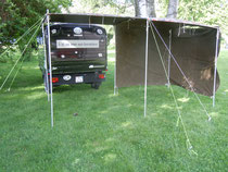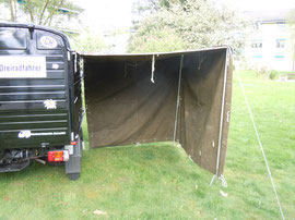 In diesem Fall wird das Zelt freistehend montiert. Da ich jedoch bemüht bin immer nach einer Lösung zu suchen wie ich etwas ohne fremde Hilfe machen kann, habe ich eine Technik gefunden wie ich ein grosses Zelt aufbauen kann. Dieses grosse Zelt ist freistehend und es wäre sogar möglich durch das Verlängern der Zeltstangen einen gedeckten Unterstand für das Fahrzeug zu bauen.